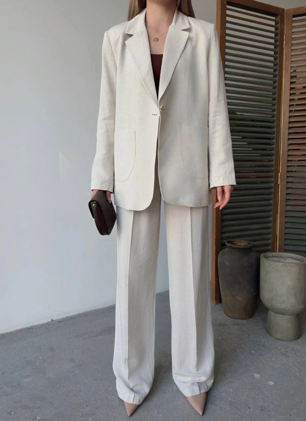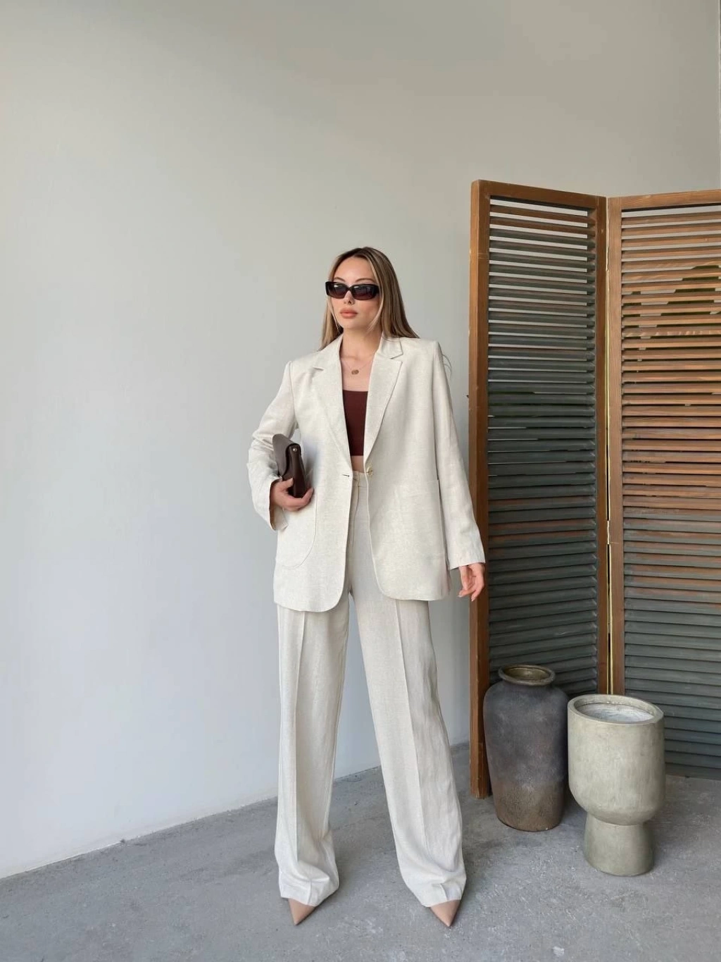 Keten Sıfır Kol Blezer Ceket Pantolon ikili Takım- Beyaz