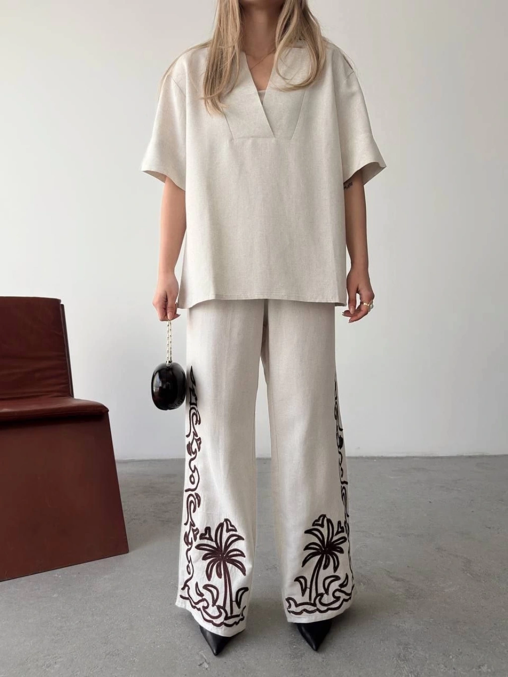 Yakalı Düğmeli Uzun Kollu Gömlek Pantolon ikili Takım - Bej