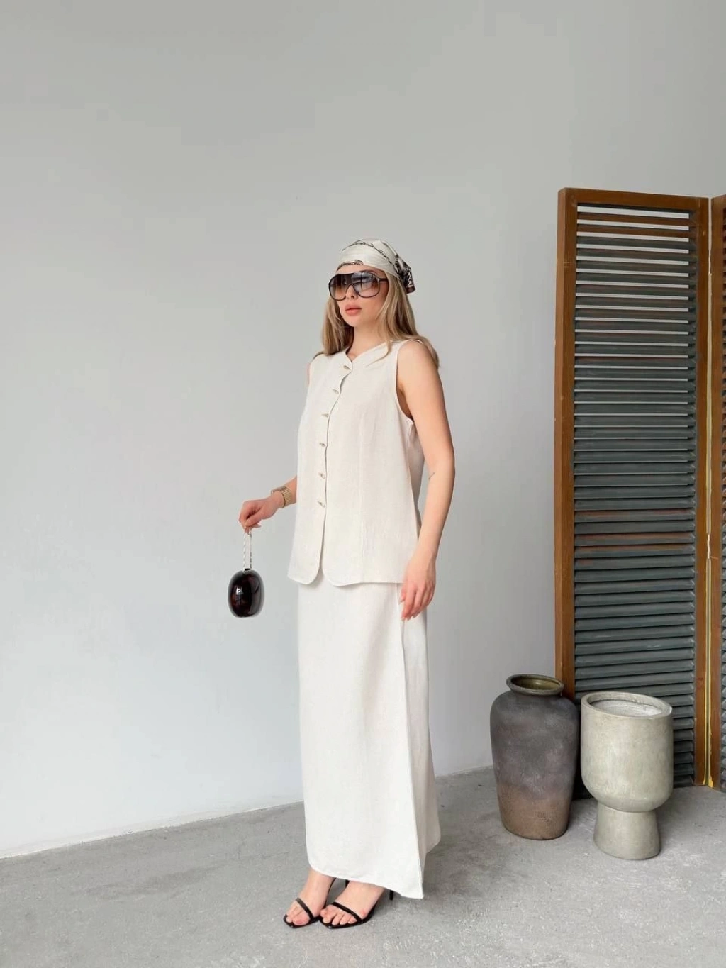 Keten Sıfır Kol Blezer Ceket Pantolon ikili Takım- Beyaz