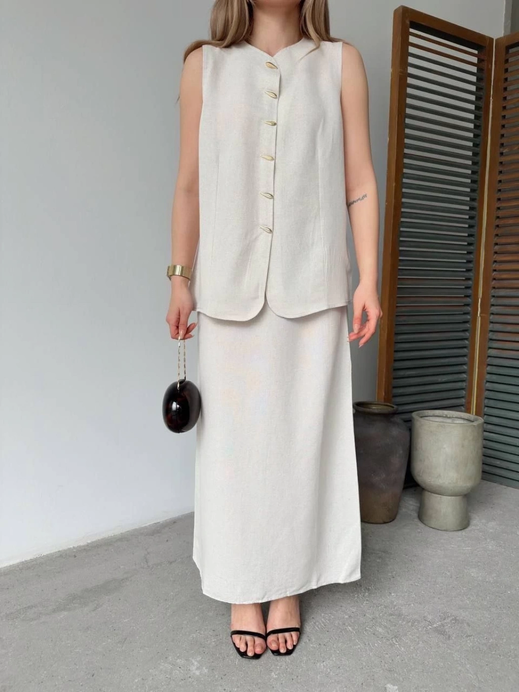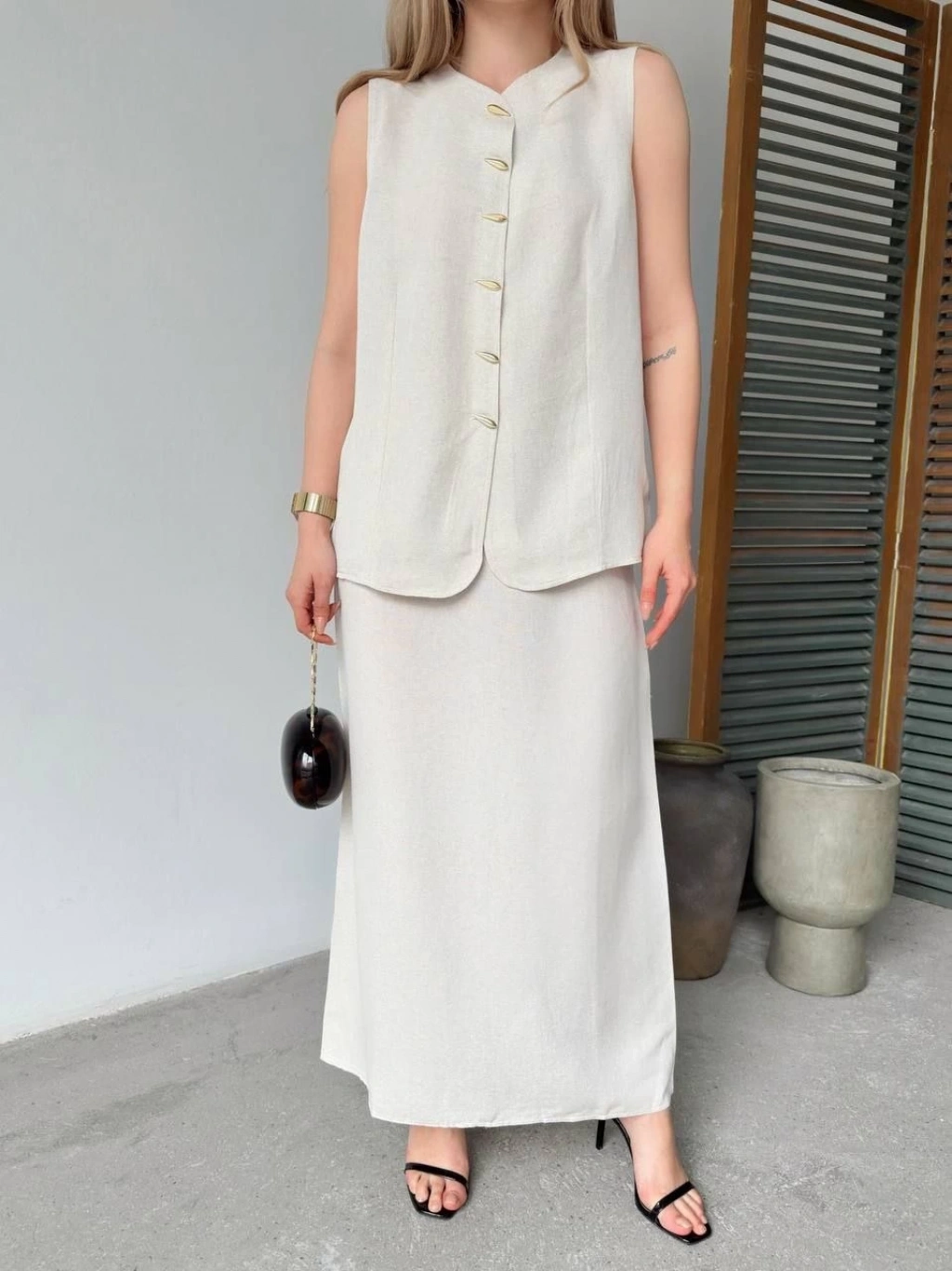 Yakalı Düğmeli Uzun Kollu Gömlek Pantolon ikili Takım - Bej