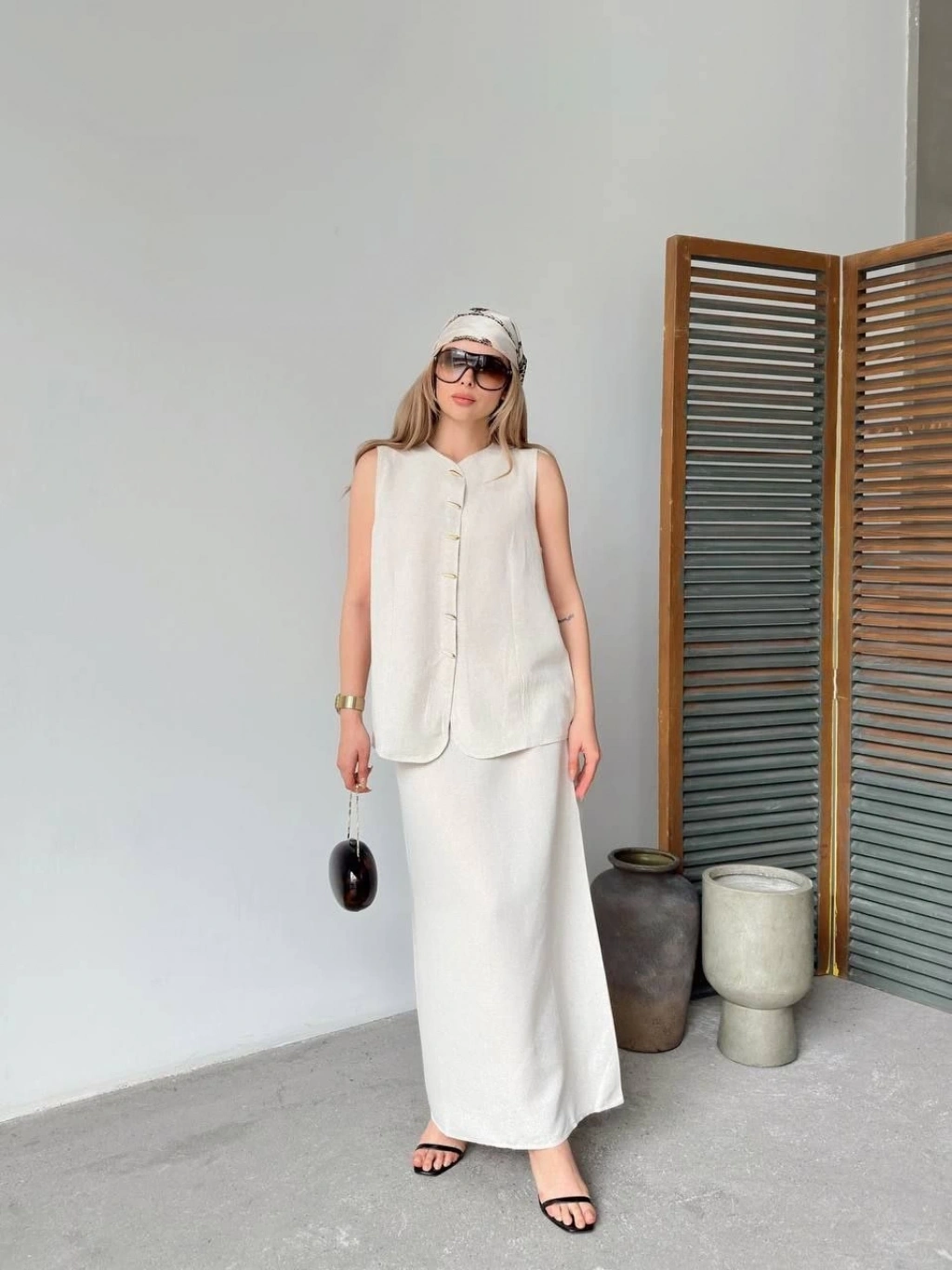 Yakalı Düğmeli Uzun Kollu Gömlek Pantolon ikili Takım - Beyaz