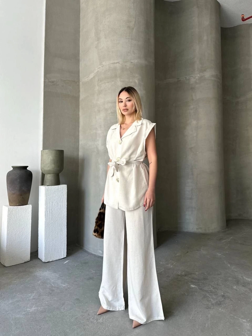 Keten Sıfır Kol Blezer Ceket Pantolon ikili Takım- Beyaz