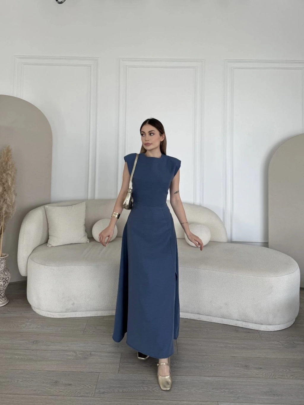 Kadın Boğazlı Uzun Fitilli Tesettüre Uygun Triko Dokuma Elbise - Saks Mavisi