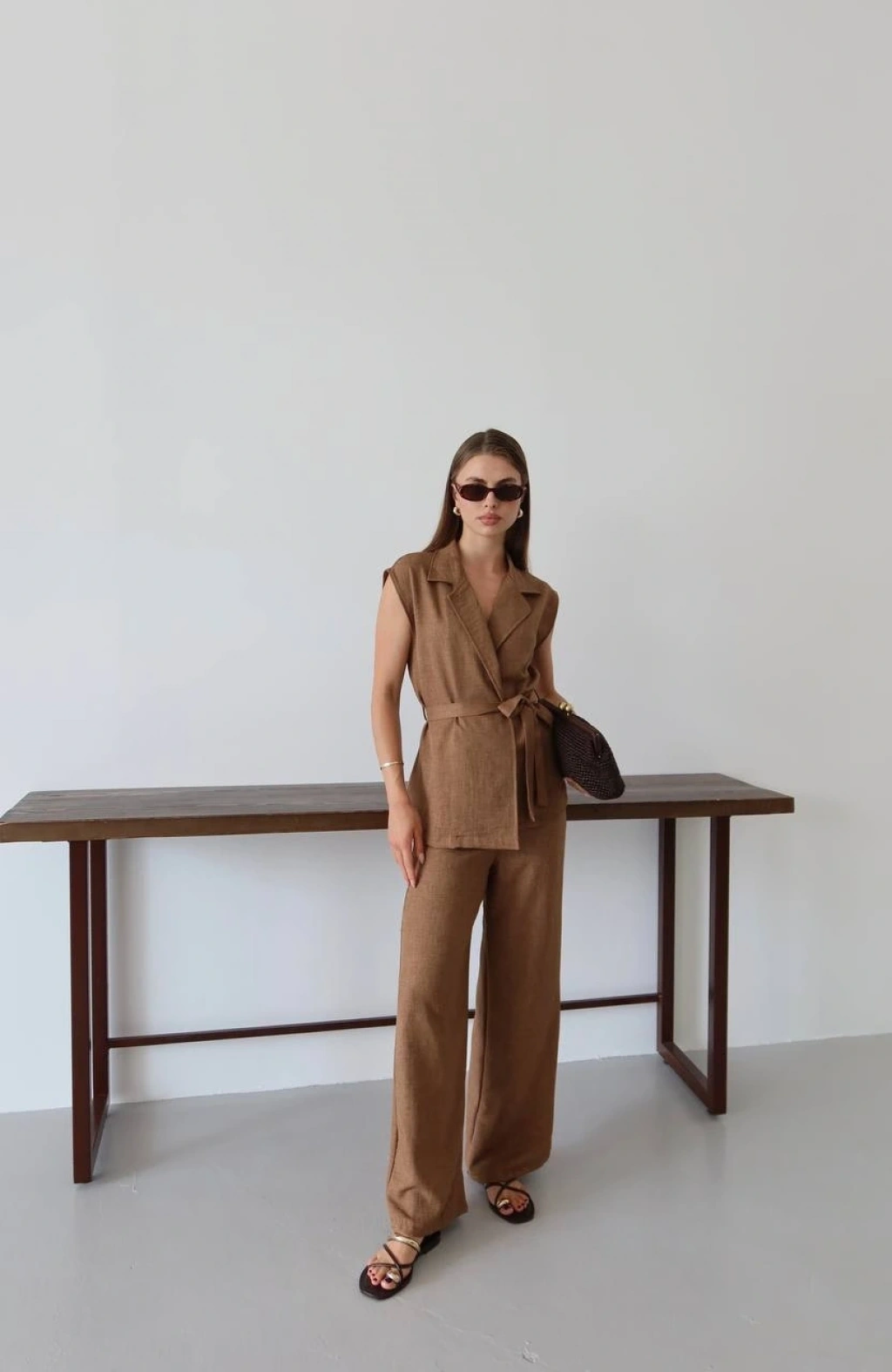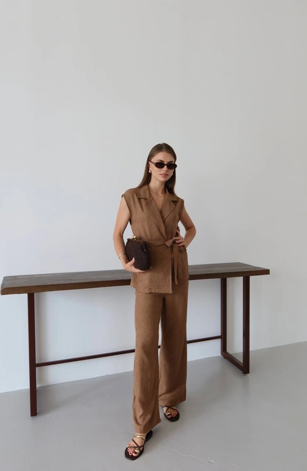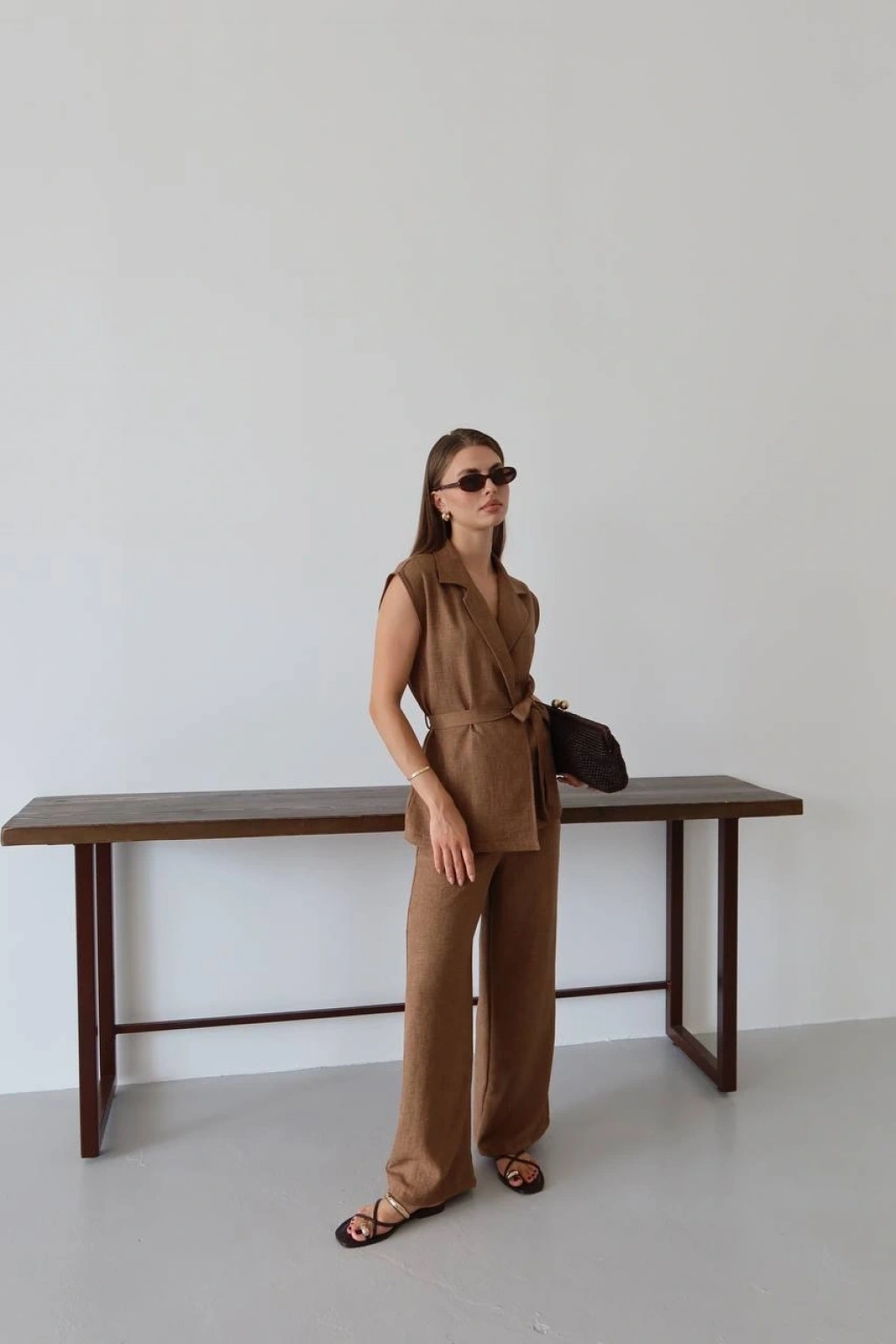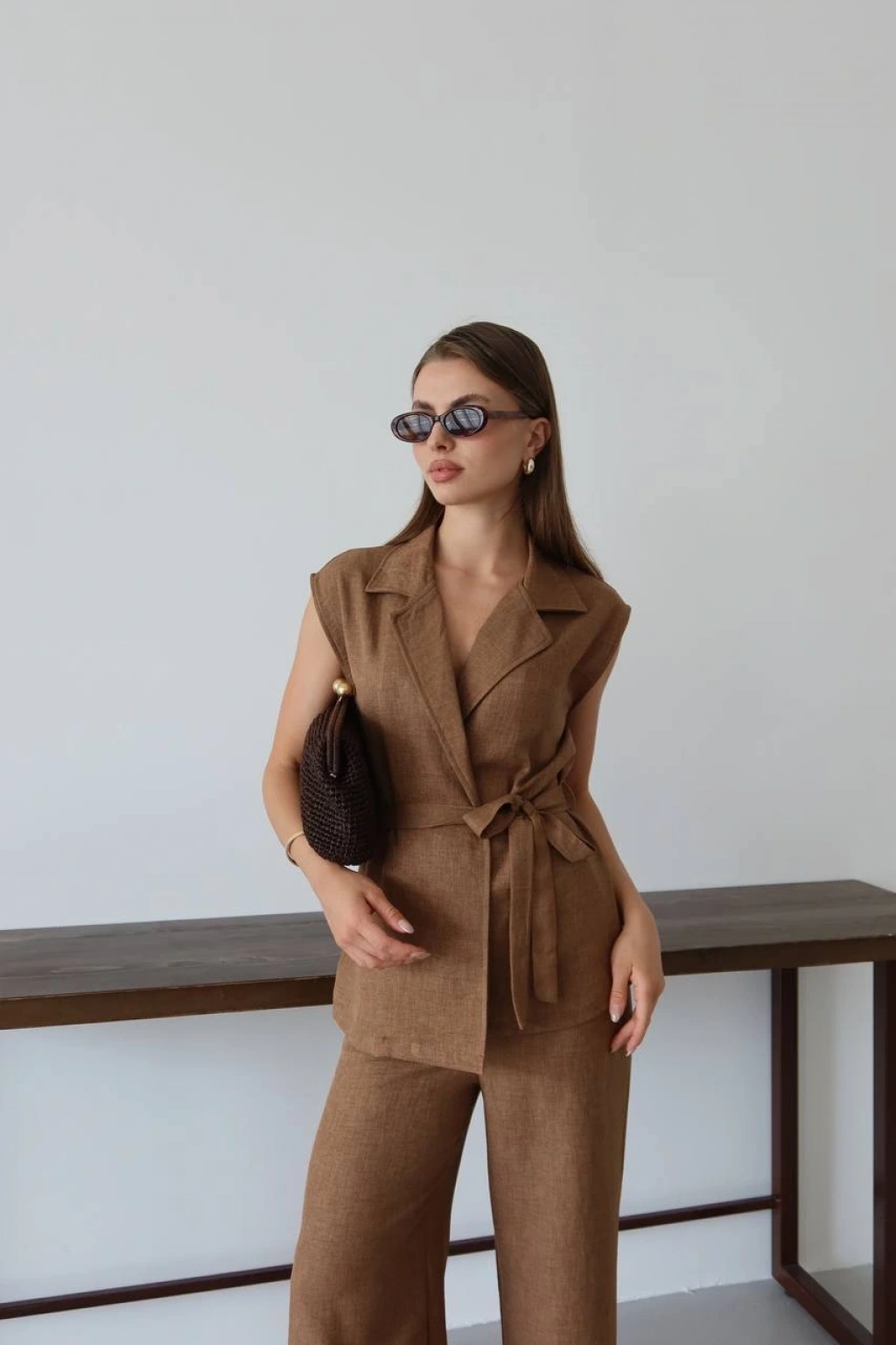 Keten yelek pantolon takım bej pt
