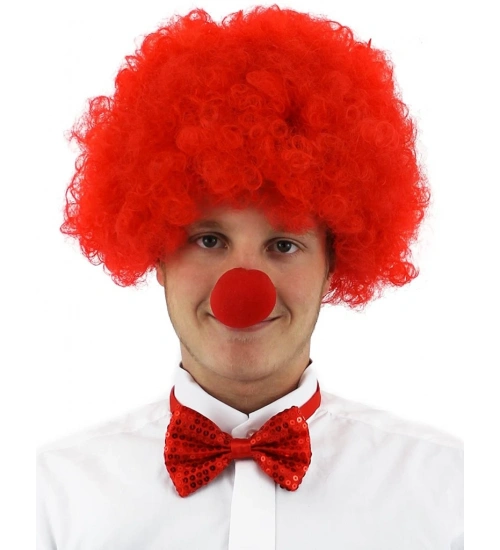 Kırmızı Renk Kıvırcık Afro Bonus Peruk Takma Saç ve Kırmızı Burun Seti