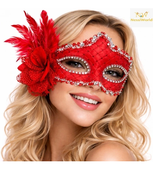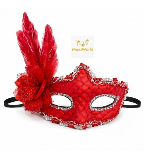 Kırmızı Tüylü Venedik Lüks Balo Maskesi