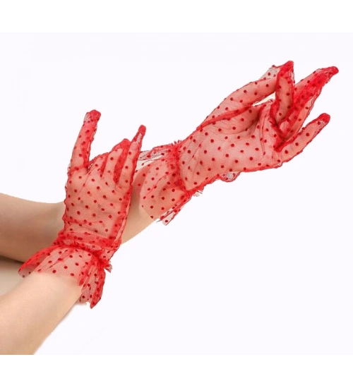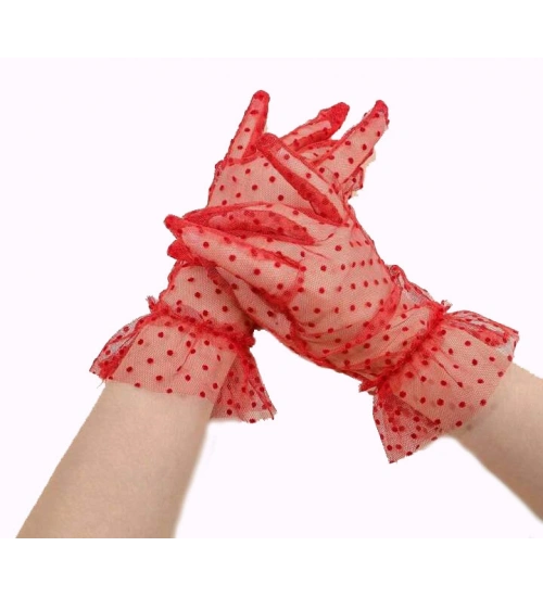 Kısa Boy Güpürlü Kırmızı Puantiyeli Tül Eldiven Kırmızı Renk