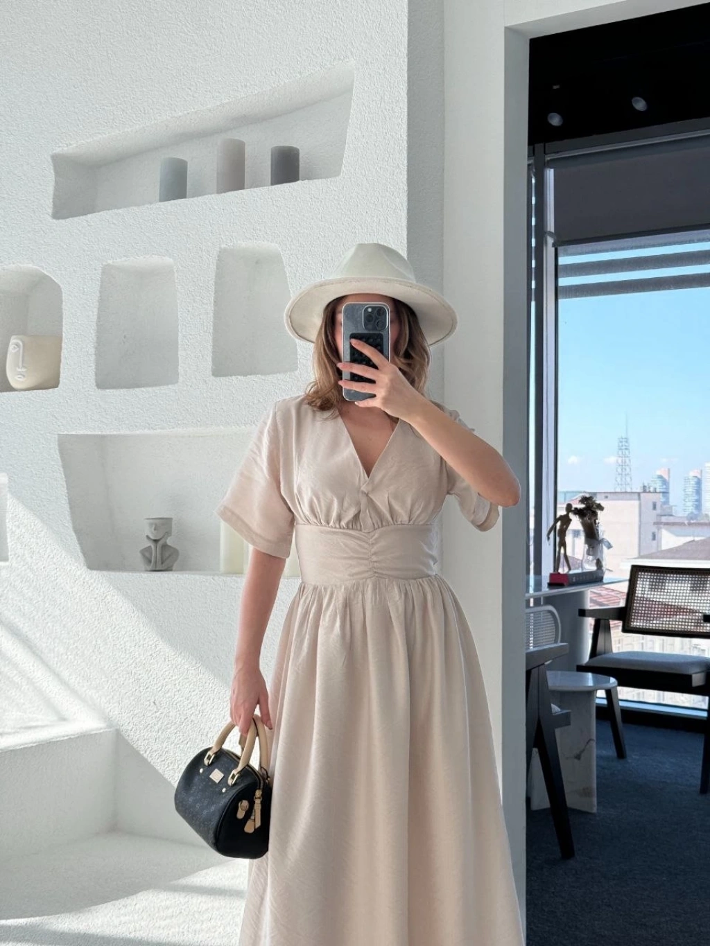 Kadın Kare Yaka Midi Boy Likralı Polelit Elbise - Bej