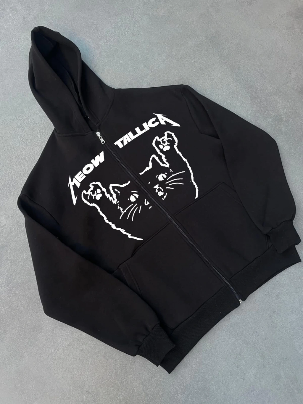 Üç İplik Baskılı Fermuarlı Kapüşonlu Hırka - Siyah
