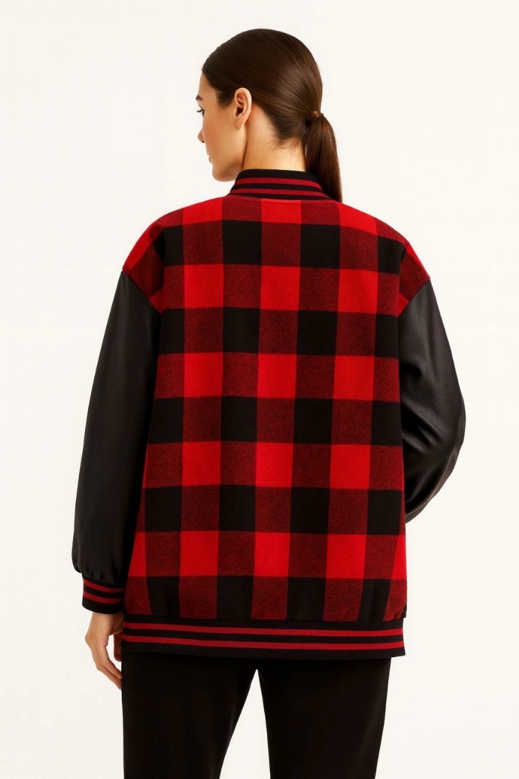 Kadın Kolej Ceket – Kareli Oduncu Kumaş, Kolları Suni Deri, Fermuarlı, İçi Kapitone Astarlı, Nakışlı Oversize Bahar & Kış Stil - Haki