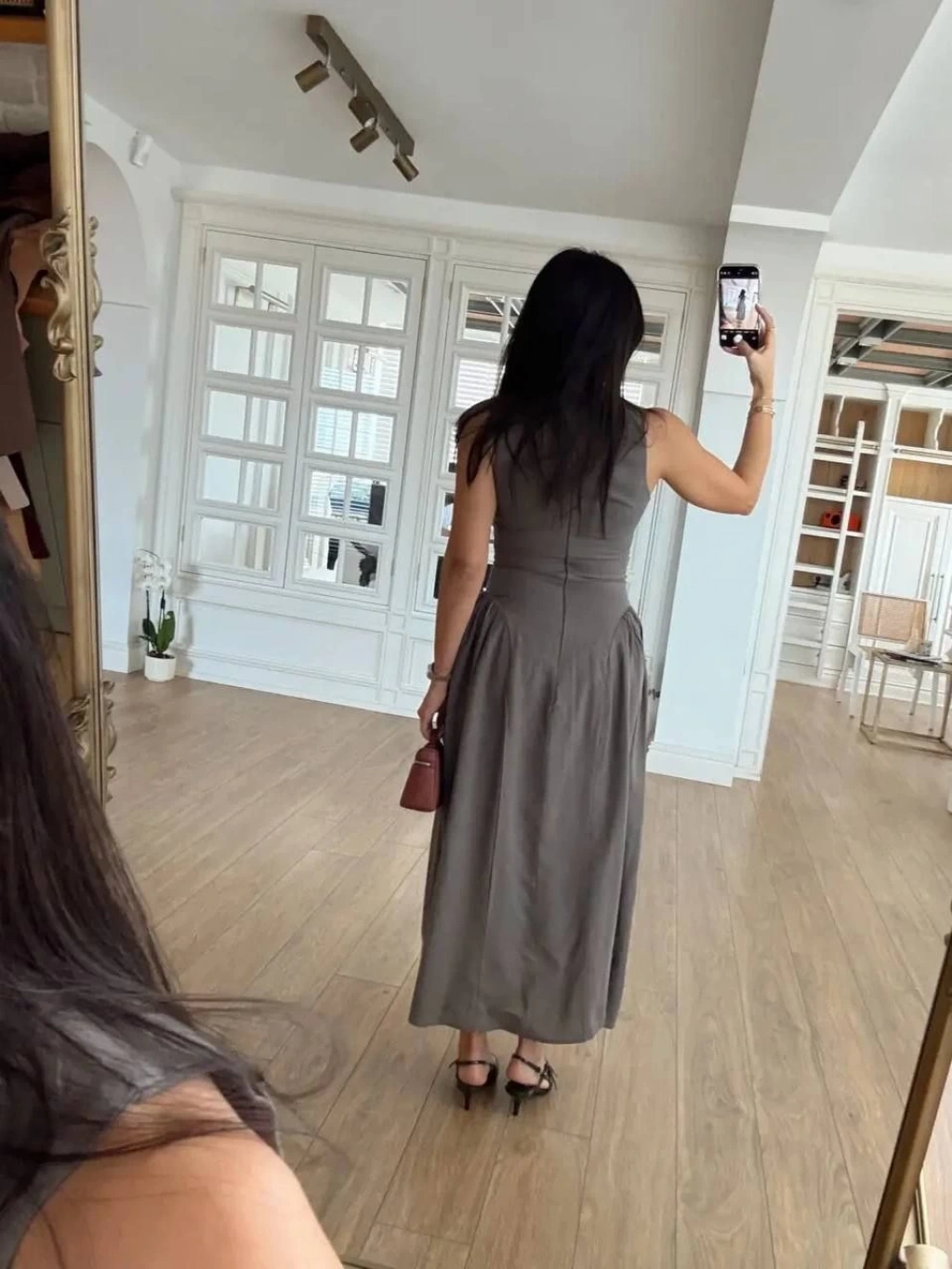 Yırtmaç Detaylı Kolsuz Düğmeli Yıkamalı Uzun Elbise - Antrasit