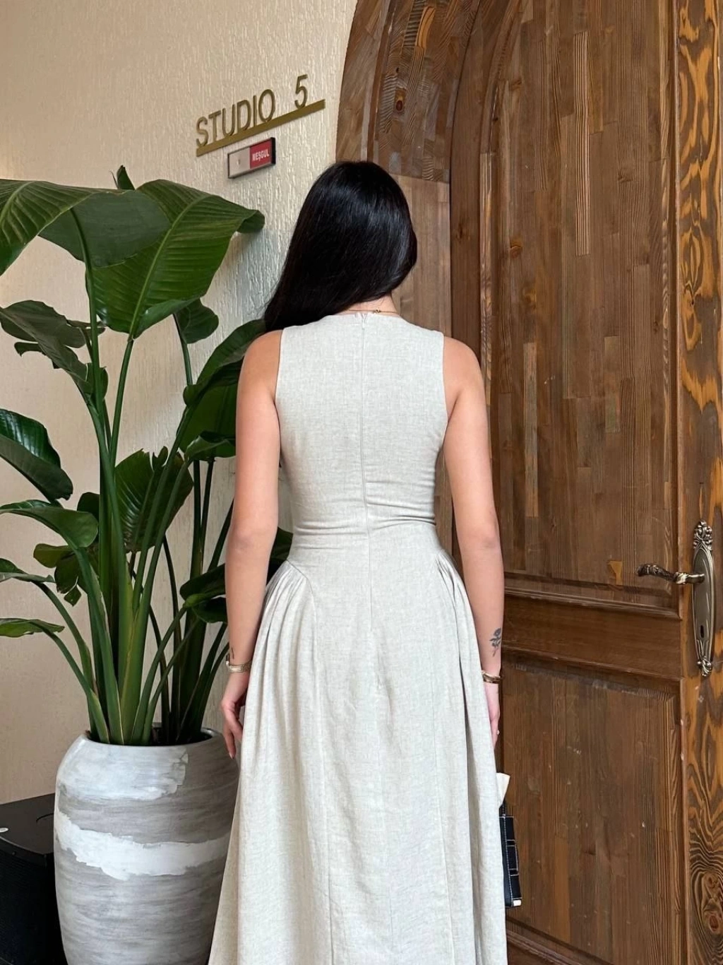 Kadın Kare Yaka Midi Boy Likralı Polelit Elbise - Bej