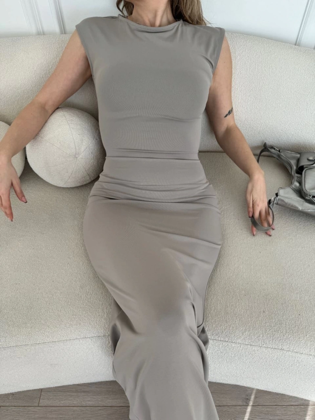 Kolsuz Yırtmaçlı Uzun maxı boy Elbise - Gri