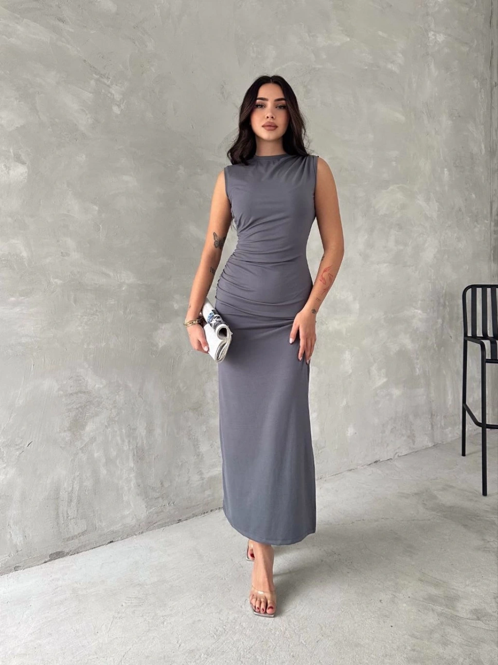 Yırtmaç Detaylı Kolsuz Düğmeli Yıkamalı Uzun Elbise - Antrasit