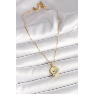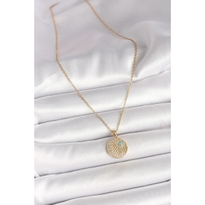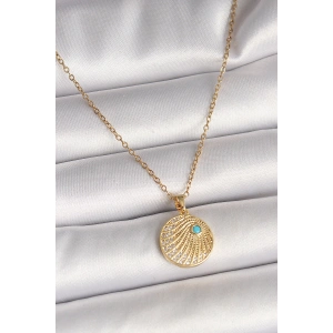 316L Çelik Gold Renk Zincir Zirkon Taş İşlemeli Mavi Taş Detaylı Madalyon Model Kadın Kolye