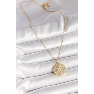 316L Çelik Gold Renk Zincir Zirkon Taşlı Ay Güneş İşlemeli Madalyon Model Kadın Kolye