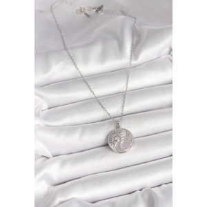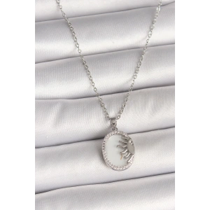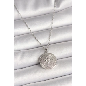 316L Çelik Gümüş Renk Zincir Zirkon Taşlı Ay Güneş İşlemeli Madalyon Model Kadın Kolye