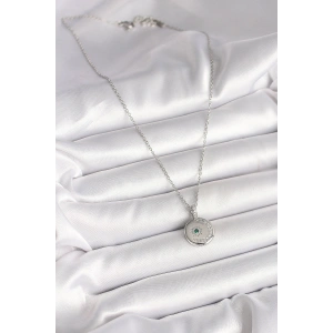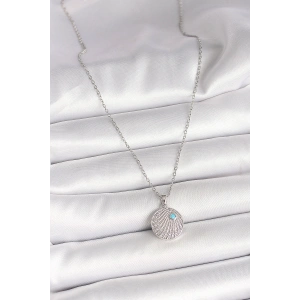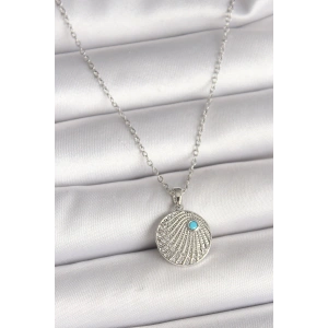 316L Çelik Gümüş Renk Zincir Zirkon Taşlı Mavi Taş Detaylı Madalyon Model Kadın Kolye