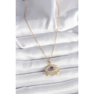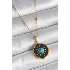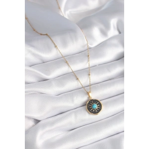 316L Çelik Gold Renk Mavi Boncuk Güneş İşleme Madalyon Model Kadın Kolye