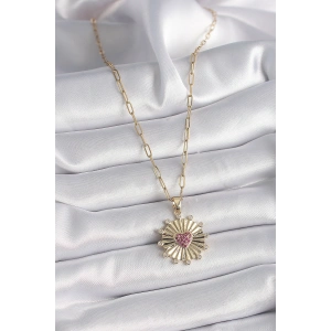 316L Çelik Gold Renk Pembe Zirkon Taşlı Kalp İşleme Madalyon Model Kadın Kolye