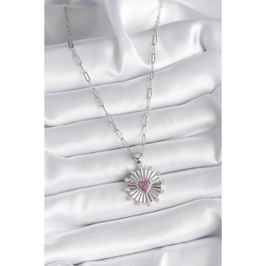 316L Çelik Gümüş Renk Pembe Zirkon Taşlı Kalp İşleme Madalyon Model Kadın Kolye