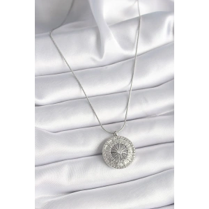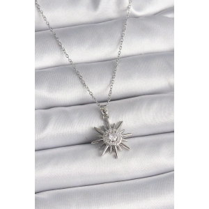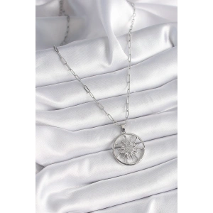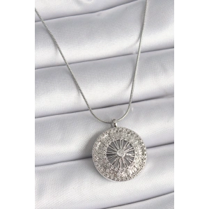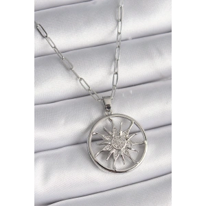 316L Çelik Gümüş Renk Zirkon Taşlı Güneş Madalyon Model Kadın Kolye