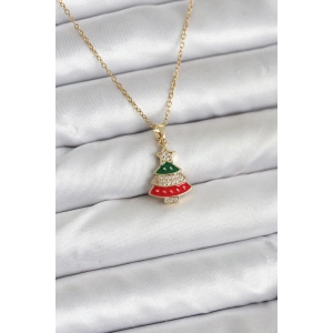 316L Çelik Zincir Gold Ren Çam Ağacı Model Zirkon Taşlı Yılbaşı Temalı Kadın Kolye