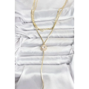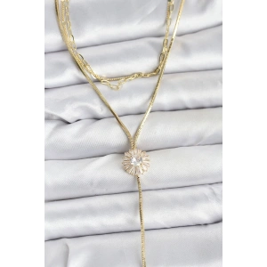 Pirinç Gold Renk Zirkon Taşlı Papatya Model Detaylı 3'lü Kombin Y Kadın Kolye