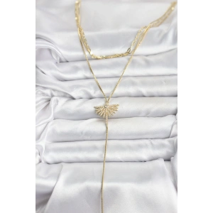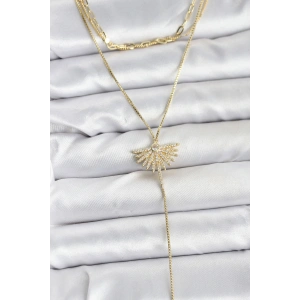 Pirinç Gold Renk Zirkon Taşlı Yelpaze Model Detaylı 3'lü Kombin Y Kadın Kolye
