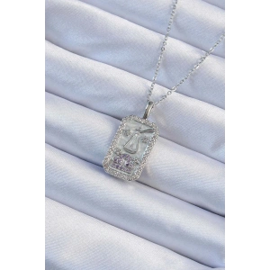 316L Çelik Zincir Gümüş Renk Lila Zirkon Taşlı Tarot Kolye