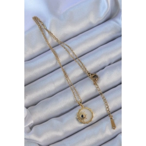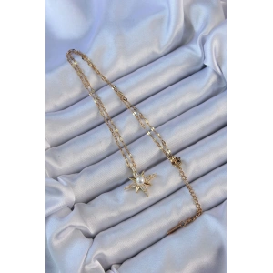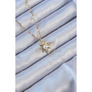 316L Çelik Zincir Altın Renk Baget Taşlı İnci Detay Kutup Yıldızı Kolye