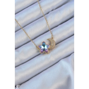 316L Çelik Zincir Altın Renk Ay Tasarımlı Renkli Zirkon Taşlı Çiçek Kolye