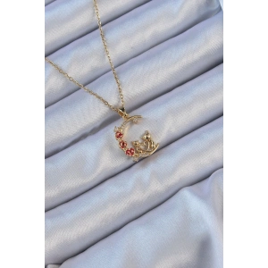 316L Çelik Zincir Altın Renk Kırmızı Gül Detay Kedi Figür Zirkon Taşlı Ay Kolye