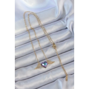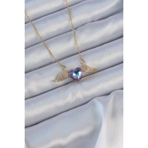 316L Çelik Zincir Altın Renk Mavi Mor Zirkon Taşlı Kanatlı Kalp Kolye
