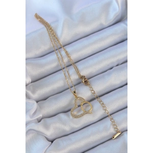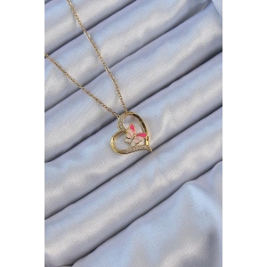 316L Çelik Zincir Altın Renk Mineli Kelebek Figür Zirkon Taşlı Kalp Kolye