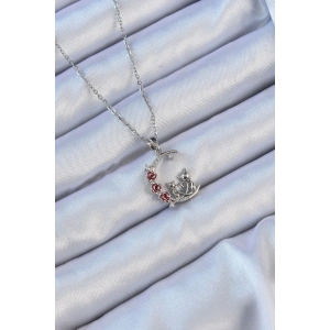 316L Çelik Zincir Gümüş Renk Kırmızı Gül Detay Kedi Figür Zirkon Taşlı Ay Kolye