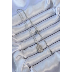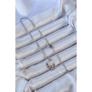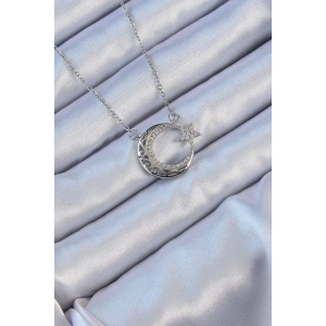 316L Çelik Zincir Gümüş Renk Zirkon Taşlı Motifli Ay Yıldız Kolye
