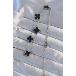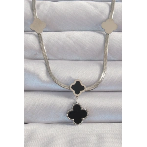 316L Çelik Gümüş Renk Siyah Mineli Yonca Kolye