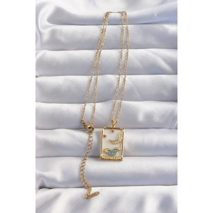 316L Çelik Zincir Gold Renk Ay Detay Mavi Zirkon Taşlı Tarot Kolye