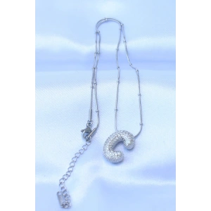 316L Çelik Zincirli Zirkon Taşlı C Harfli Gümüş Renk Bubble Kolye