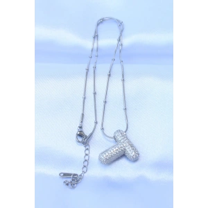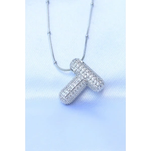 316L Çelik Zincirli Zirkon Taşlı T Harfli Gümüş Renk Bubble Kolye