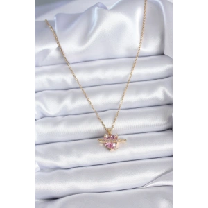 316L Çelik Zincir Gold Renk Pembe Zirkon Taşlı Charm Kadın Kolye
