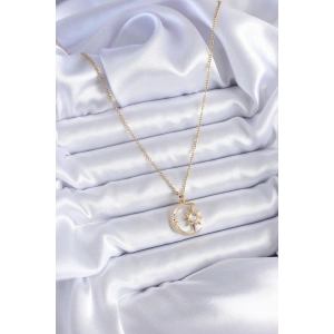 316L Çelik Gold Renk Zirkon Taşlı Ay Yıldız Model Kadın Kolye