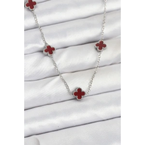 316L Çelik Zincir Gümüş Renk Bordo Renk Yonca Kadın Kolye