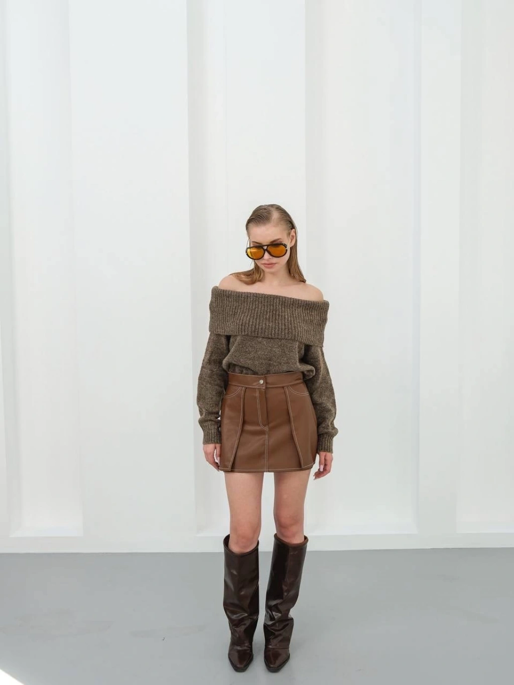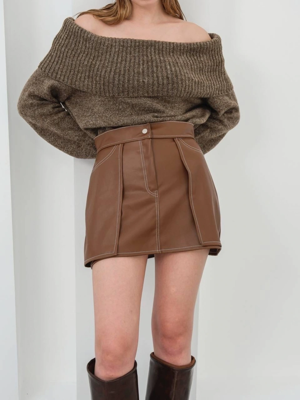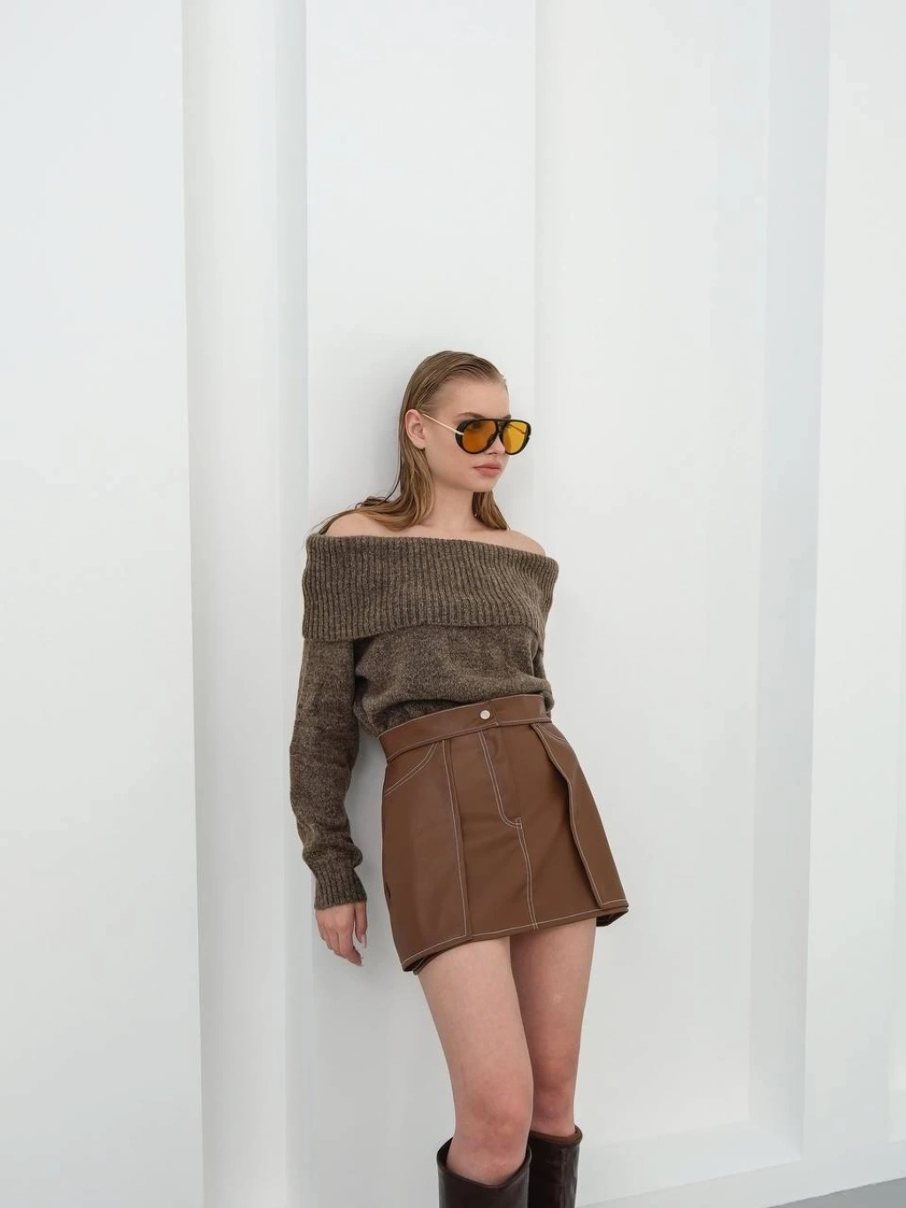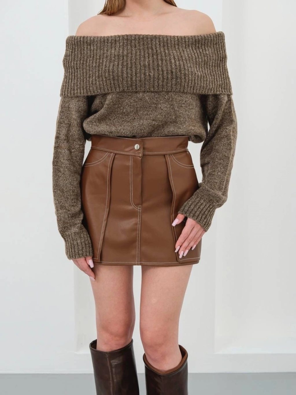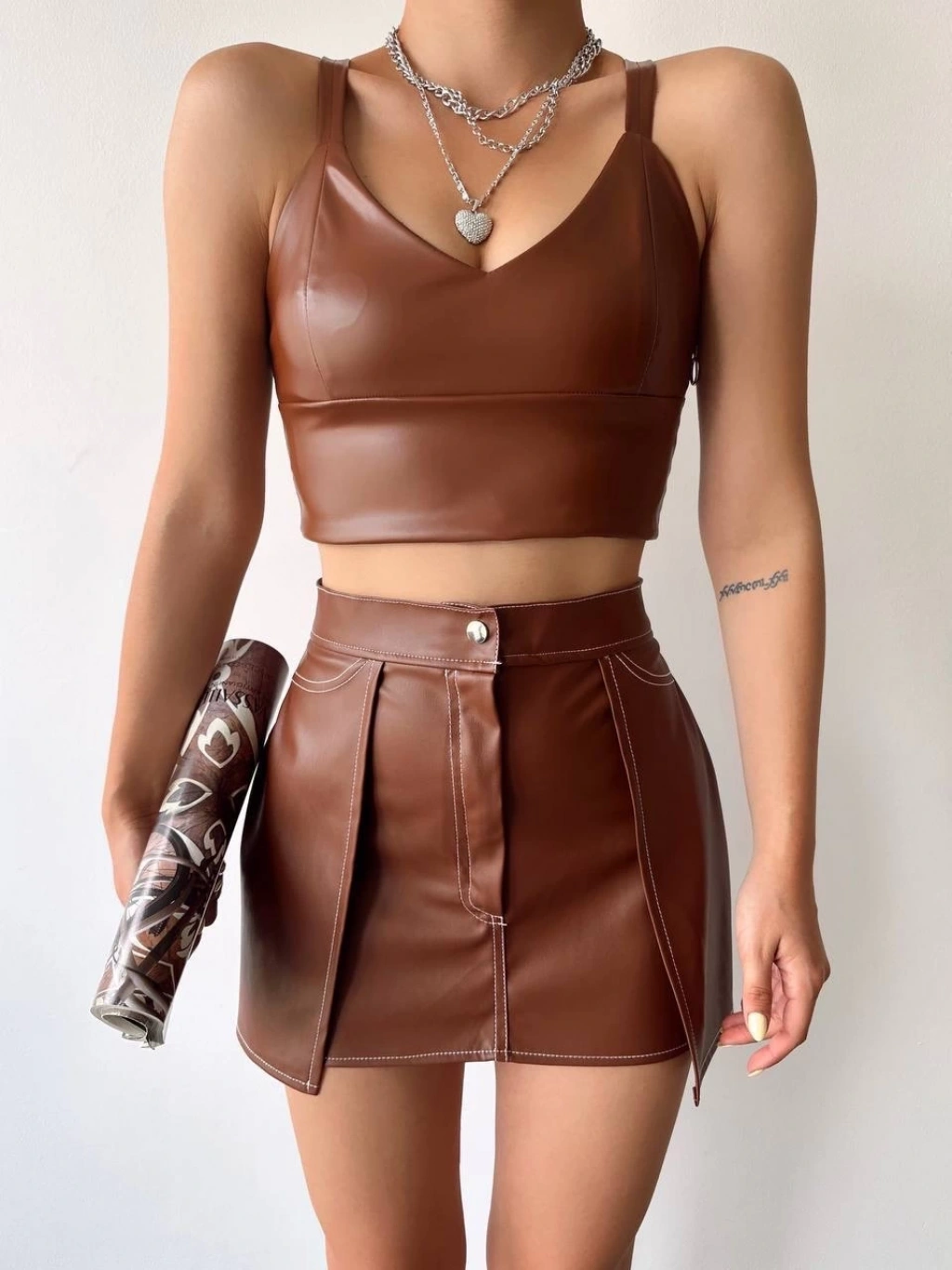 Yıldız baskılı deri etek kahve