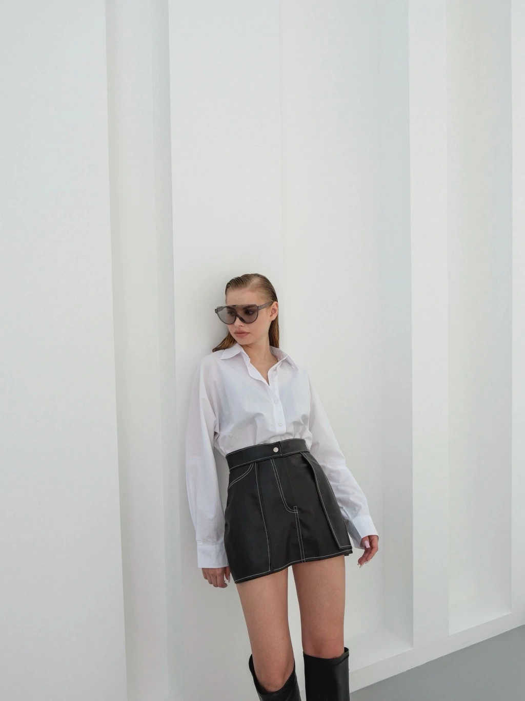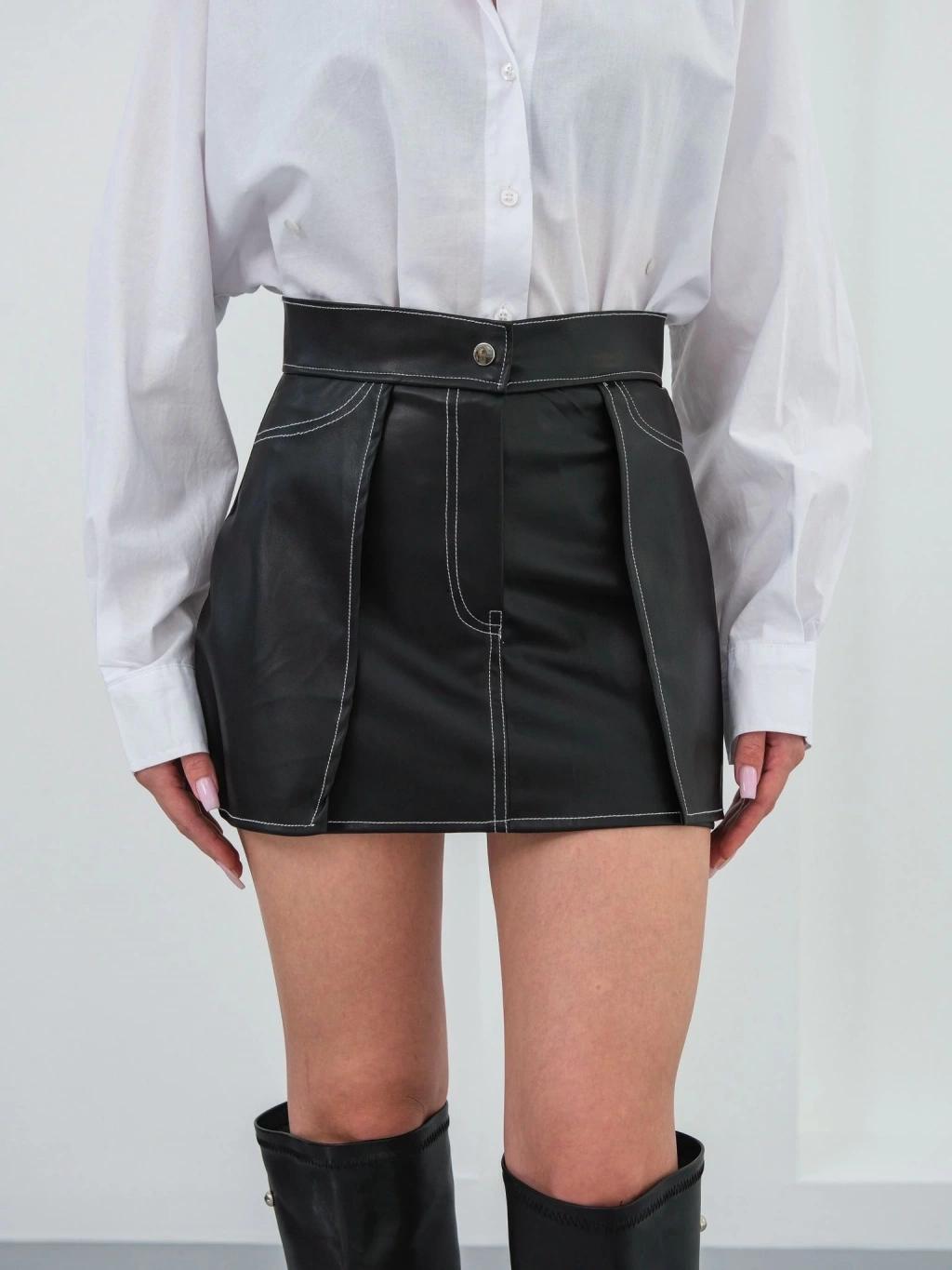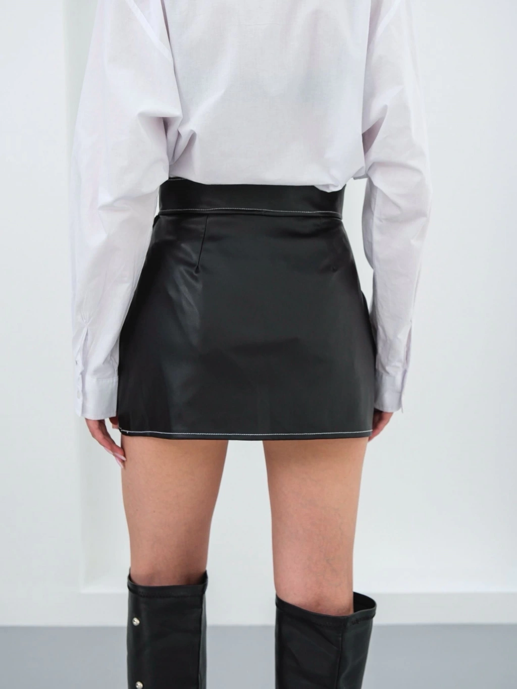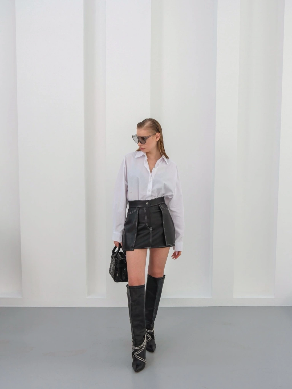 Cep detaylı oval kapaklı deri etek siyah h240048