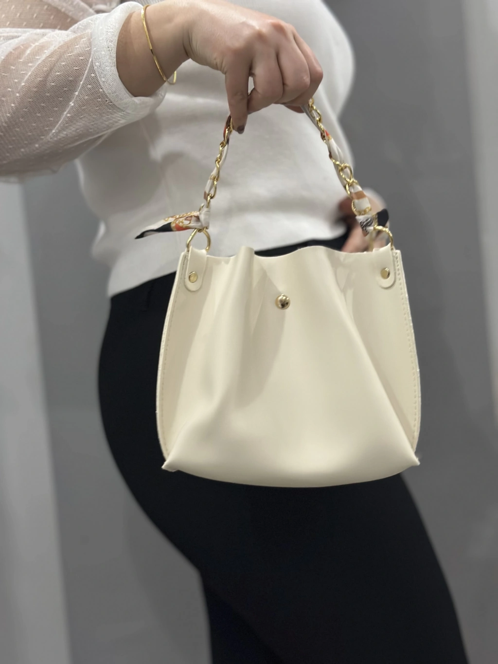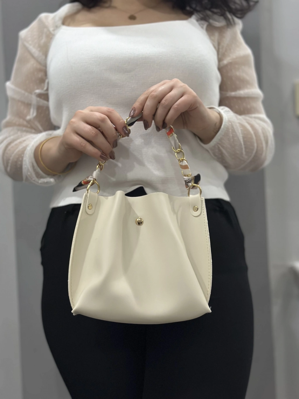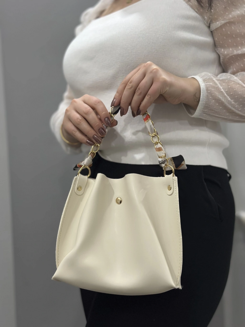 Krem Cilt Zımbalı Çanta, şıklığı ve kullanışlığı bir arada sunar. Farklı renk seçenekleri ile her tarza uyum sağlayan bu çanta, günlük kullanımdan özel davetlere kadar geniş bir kullanım alanına sahiptir.