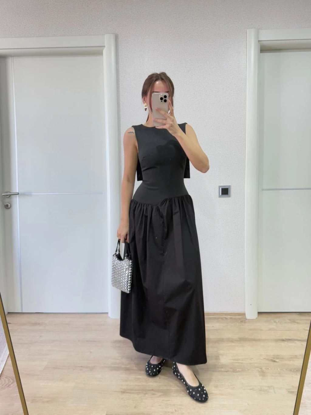 SIRT DEKOLTELİ KOLSUZ UZUN ELBİSE - SİYAH