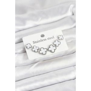 316L Çelik Gümüş Beyaz Renk 3 Boy Yonca Küpe Seti