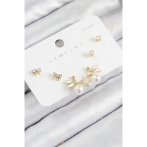 Pirinç Zirkon Taşlı İnci Melek Model Gold Renk 925 Ayar Gümüş Çivi Kadın Küpe Set